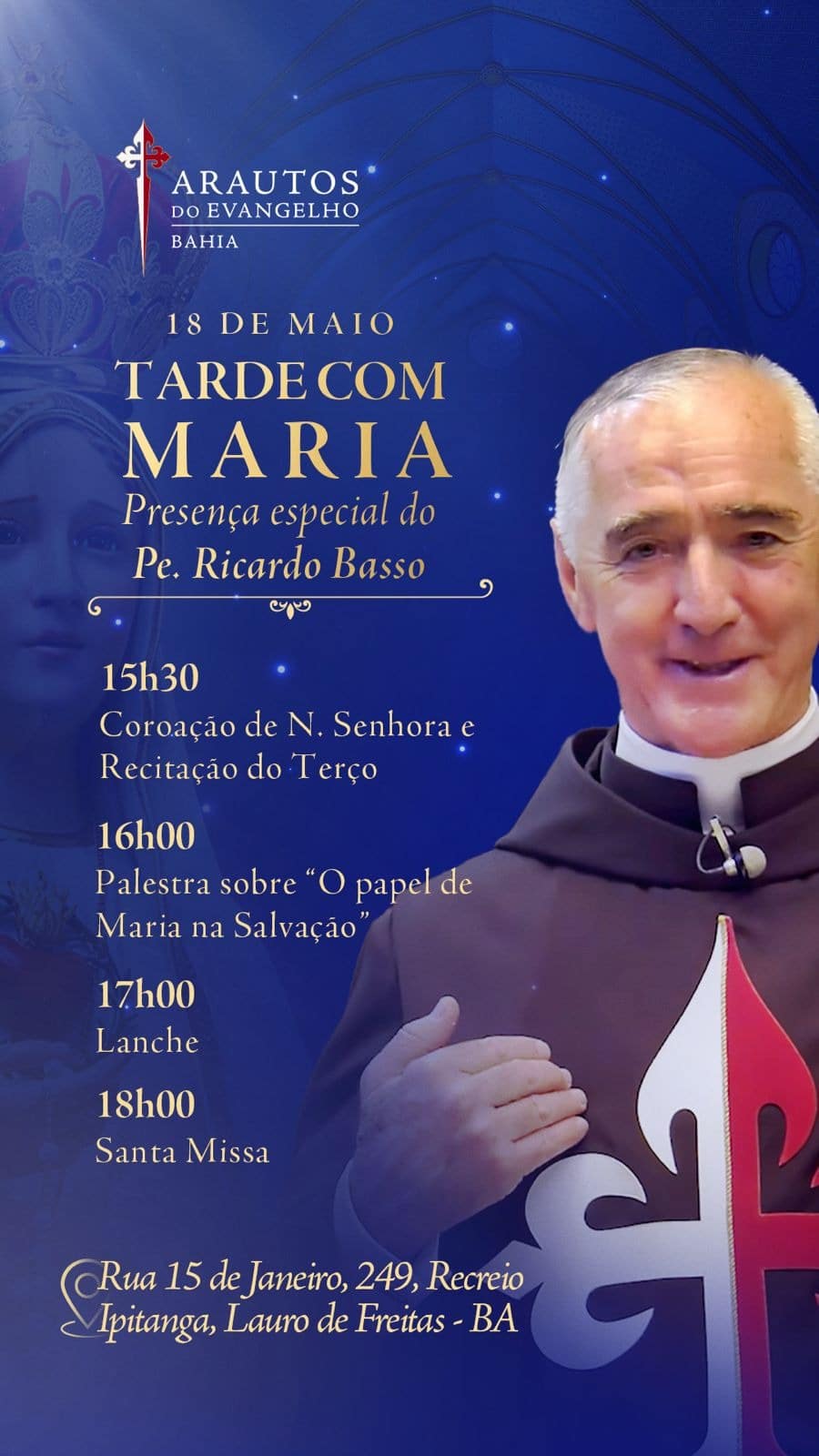 ⭐ Local: IGREJA DE SÃO SALVADOR – Arautos do Evangelho Rua 15 de janeiro, 249 (antiga Rua Cel. Messias, 249) Recreio do Ipitanga 42721-800 Lauro de Freitas – BA Veja no mapa: https://goo.gl/maps/ttByL9gc1jKuyaQKA