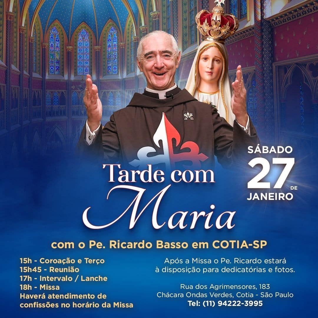 Em Cotia-SP, no sábado, dia 27 de janeiro, participe de uma tarde especial com as famílias consagradas a Nossa Senhora ou devotas d’Ela,✨ e com os Arautos do Evangelho.
